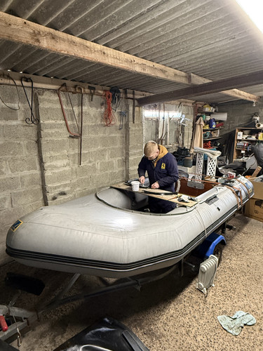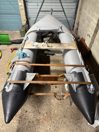 Got the floor back on, not entirely happy with it as it's difficult to pull it tight and hold it there while the glue sets. So it's ended up around 10mm further in all round the tubes, which has resulted in some wrinkles. Going to do a few touch ups next time on bits that didn't stick so well and then flip the boat over and do the inside parts of the floor.