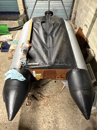 Don’t trust the rowlock pins, they vibrate loose, fit a short cord from the oar to the lace cuff, or will be bye-bye to the oars if you’re out in anything lumpy. Once you lift the floor you can see the inflatable keel. The leak at the transom end were the material folds over. Will be interesting repair. Occasionally the aluminium floors come up for sale.